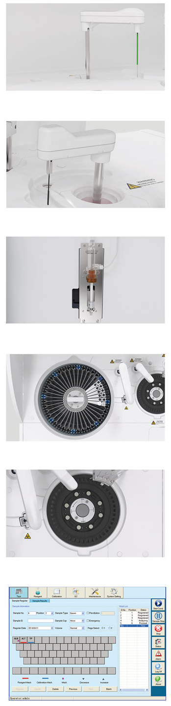 Machine type: Random access, open reagent & locked reagent(Optional) Test speed: Constant 200 test/hour(Single or double reagent) Test principle: Colorimetric method, turbidimetry Test method:1 point end,2 point end, Fixed-Time, Kinetics Sample tray:40 sample positions. Sample cup type: Micro cup & test tube Reagent tray:80 reagent positions Sample volume: 2-30ul.step bu 0.1ul Reagent volume:2-300ul,step by 1 ul Sample & Reagent bar code reader(Optional) Reagent unit Reaction tray: 44 high quality plastic cuvettes Reagent volume:150ul-350ul Reaction time:10 minutes Temperature: Petler pad incubation system. Reaction temperature (37 ℃± 0.1℃ ) Cuvette washing:3*4 steps automatic washing