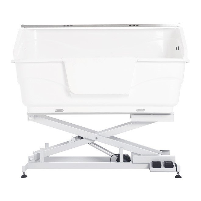 The sturdy base and electric lift system easily support more than 260lbs. The tub lowers to within 14″ of the ground, making it a stroll for large breeds and older dogs to enter and depart the tub.